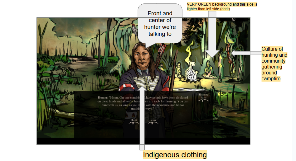 The green color of the background, the emphasis on the hunter and his clothing being placed in the center, and the community being represented in the background campfire all demonstrate meaningfulness as it tells a story of how people were displaced and survived together in awkward places.