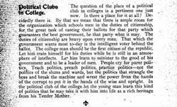 Adelbert College men were urged to political activism by the editors of their newspaper, “The college man should be the first citizen of the republic. Let him train himself for his duties while he is still in an atmosphere of intellects… Teach politics, preach politics, practice politics – not the politics of the slums and wards, but the politics that strangle the boss and break the machine and wrest the power from the hands of the corrupt and put it in the hands of the wise and upright.”