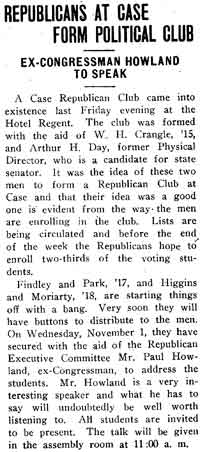 Case students formed a Republican Club. Paul Howland, ex-Congressman, addressed the students on November 1.