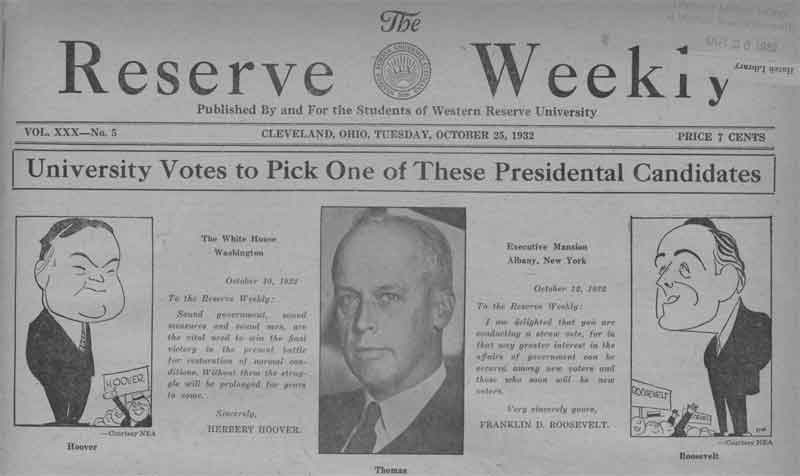 The issue of the Reserve Weekly below featured letters from Hoover and Roosevelt and images of Hoover, Roosevelt and Socialist Party candidate, Norman Thomas, before the straw vote.