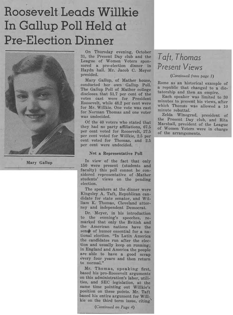 Roosevelt led Willkie in the "Gallup Poll" of Mather College 51% to 48%.