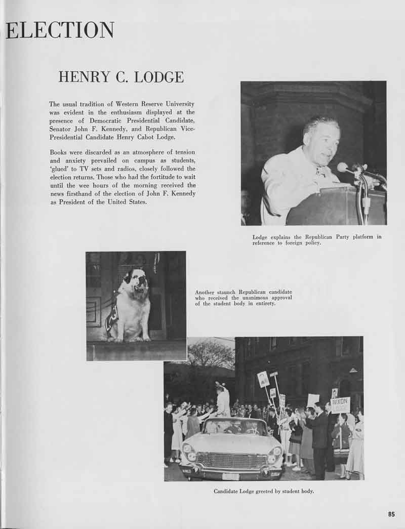 The WRU yearbook, Lux, covered the visits to Cleveland and the campus by the candidates: John F. Kennedy and Henry Cabot Lodge (below).