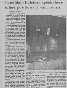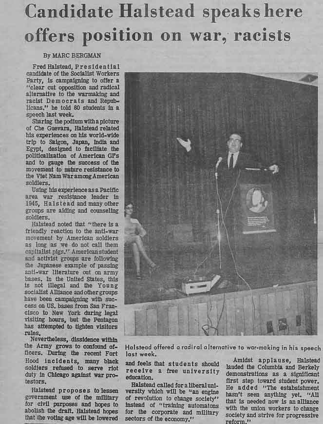 - Article about Socialist Workers Party presidential candidate Fred Halstead speaking on campus