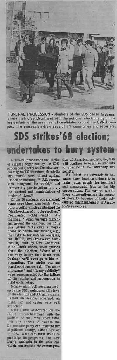 Students demonstrated, picketed, and heckled during Cleveland appearances by Hubert Humphrey (D), George C. Wallace (American Independent), and Richard M. Nixon (R). “They must be teaching anarchy in the universities today,” was Wallace’s response to hecklers. On November 1, Students for a Democratic Society (SDS) protested the presidential election. Carrying two caskets, meant to symbolize the Democratic and Republican parties, they expressed their disenchantment with the national elections.