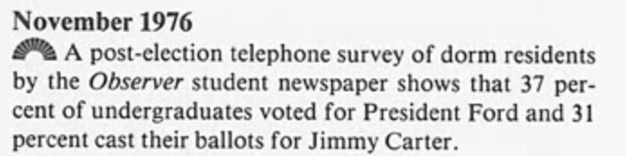 As reported in the University's 1976/1977 Annual Report (left), students preferred Gerald Ford to Jimmy Carter in a telephone survey (right).