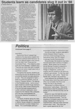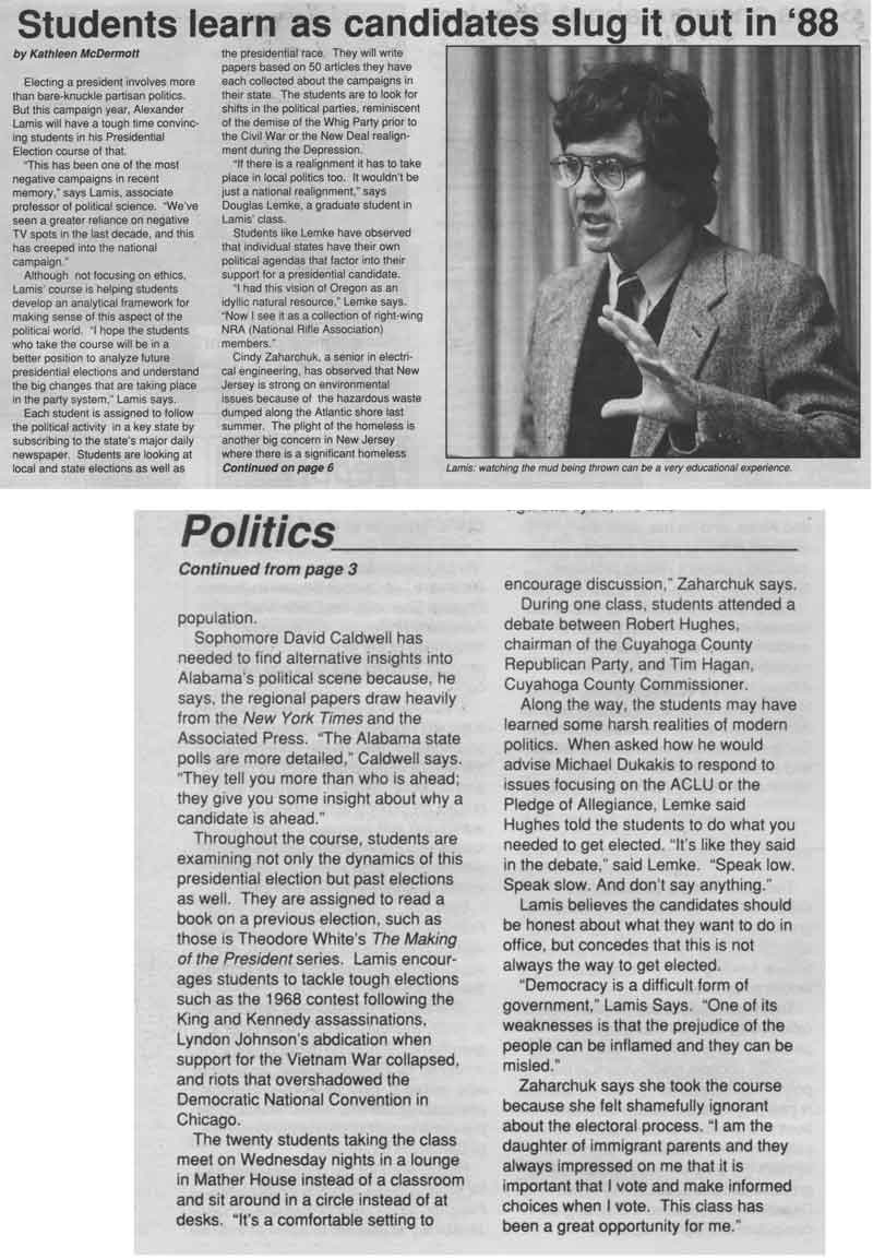Political Science 320, The Presidential Election, taught by Associate Professor Alexander Lamis, required students to follow local and national political activity in a key state. Assignments included subscribing to the major daily newspaper in the state and attending a debate between Cuyahoga County Democratic and Republican Party leaders. Explained Lamis to Campus News reporter Kathleen McDermott, “I hope the students… will be in a better position to analyze future presidential elections and understand the big changes that are taking place in the party system.”