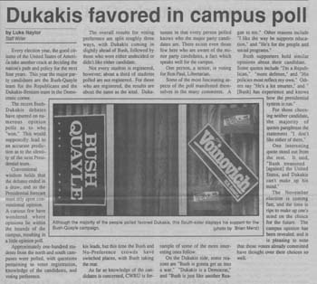 Democrat Michael Dukakis led Republican George Bush in a campus poll.