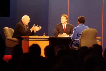 Republican candidate Dick Cheney and Democratic candidate John Edwards with moderator Gwen Ifill.