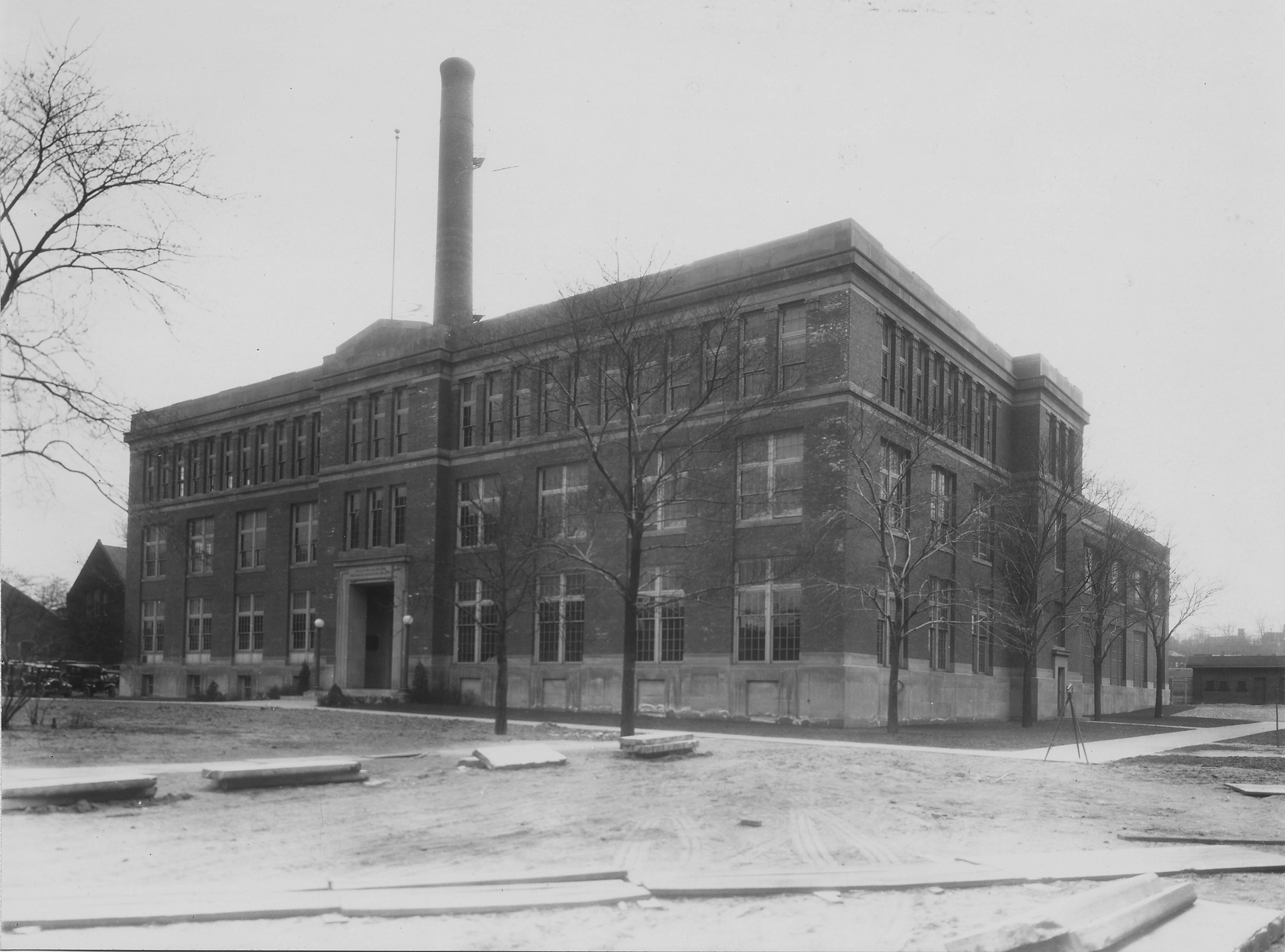 Structural steel frame, shale brick with sandstone trim; front portion: 3 stories with basement, 146x55 feet; west wing: 2 stories, 119x50 feet; east wing: 1 story, 119x60 feet; powerhouse: 1 story, 65x70 feet; repair shop: 1 story, 21x35 feet; containing classrooms, labs, offices, shop, power plant