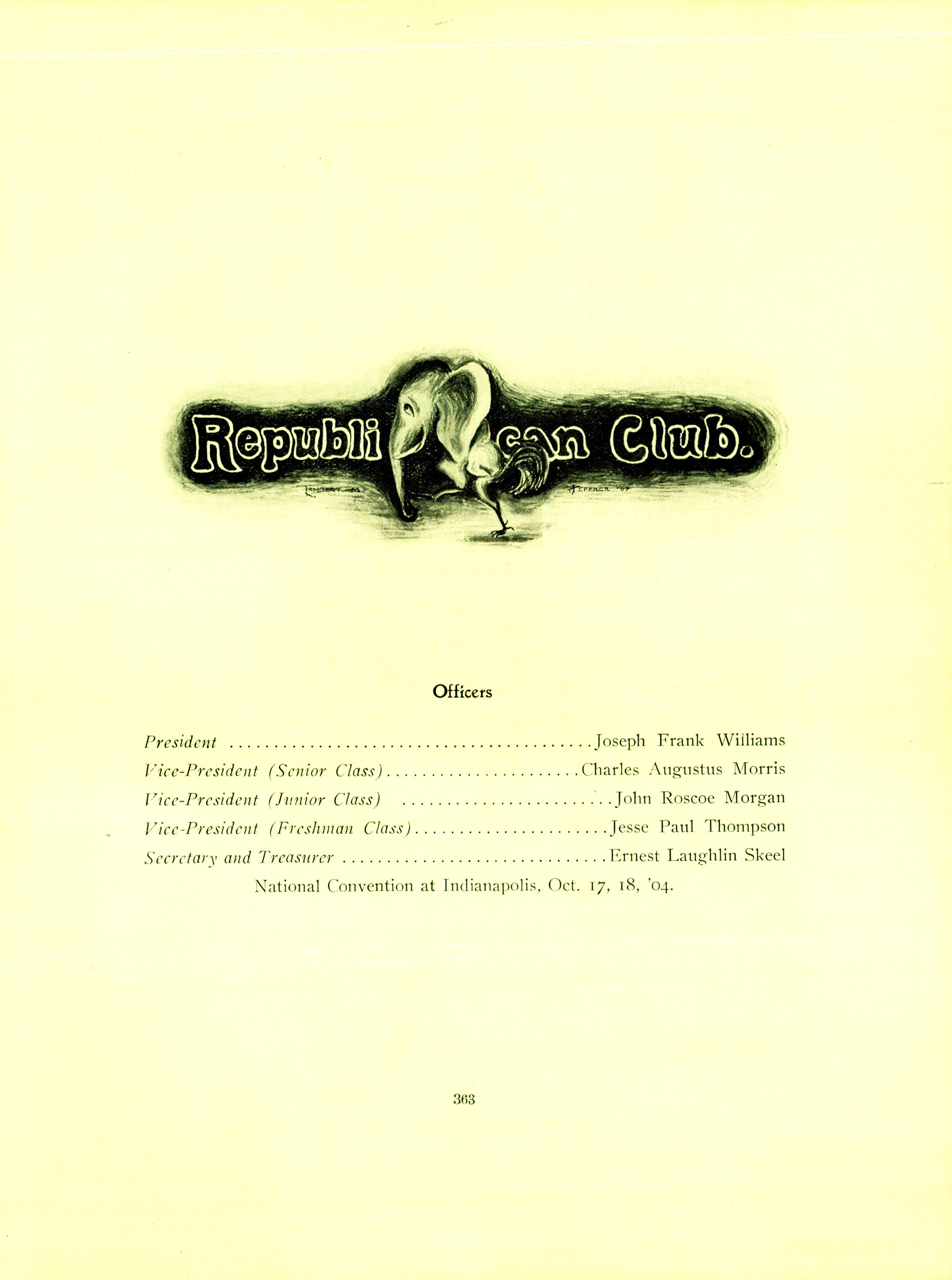 Called His Accidency by opponents referring to his succession to the presidency after McKinley's assassination, Roosevelt was the first former vice president elected since 1836.1904The Law School Republican Club was the only documented student political activity this year.