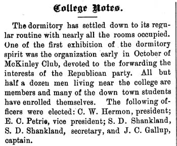 Eugene Debs was nominated for the first of five times by the Socialists, on a platform including female suffrage.1900An editorial in the student newspaper affirmed there was a place in college for political clubs, "The college man should be the first citizen of the republic..."