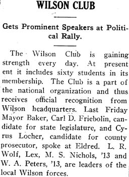 Wilson's New Freedom competed with Roosevelt's New Nationalism.1912The Wilson Club brought state and local candidates, including Cleveland Mayor Newton D. Baker, to campus to speak to the students.