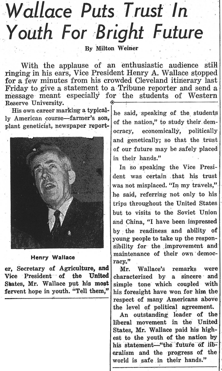Both major party presidential candidates (Franklin D. Roosevelt and Thomas E. Dewey) were from New York.1944Vice President Henry Wallace, at a stop in Cleveland on October 13, told a Reserve Tribune reporter to tell students to "study their democracy, economically, politically and genetically; so that the trust of our future may be safely placed in their hands."