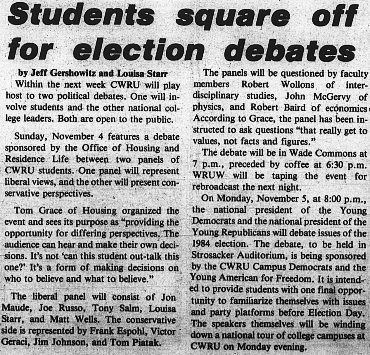 Geraldine Ferraro was the first woman on a major party ticket.1984At the Election Issues Debate at Thwing Center on the CWRU campus, Cuyahoga County Republican Party leader, Bob Hughes, squared off against Tim Hagan, Democrat, Cuyahoga County Commissioner.
